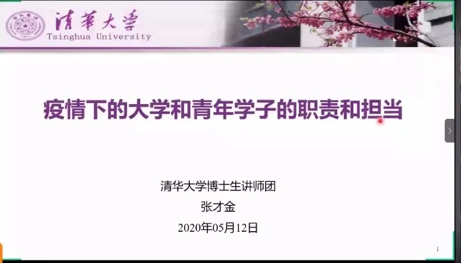12日晚七点,清华大学水利系2019级博士生张才金,以《疫情下的大学和青年学子的职责和担当》为主题展开宣讲,向学生们分别阐述了当代大学在此次疫情期间所做的贡献和广大青年大学生付出的努力。她谈到,面对严峻的疫情状况,各大高校纷纷承担起相应责任,密切关注疫情发展,做好防控措施,各显所长各尽其能,筹集物资、派遣医护人员、开展疫苗研发工作等。而广大高校青年学子,更是肩负起责任与义务,在志愿服务、防疫宣传等各个方面献出力量。充分反应了当前高校与青年学子们在疫情期间的责任与担当意识。