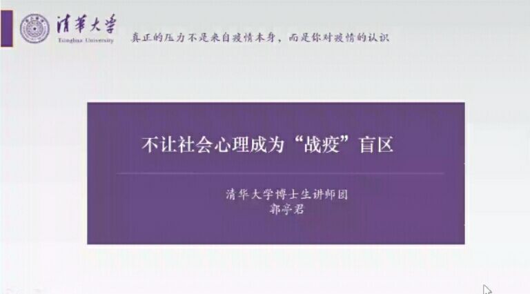 13日晚同一时间,清华大学社科院2019级硕士生郭亭君,以《不让社会心理成为战“疫”盲区》为主题,向教院学子们介绍了疫情期间的群体心理状况与情绪变化。她谈到,疫情对国民心理上的影响是非常明显的,会表现出不同的负面情绪。还指出这其实是一种心理危机状态,且对个人的身心发展具有危害性。她强调心理危机干预的必要性,并就国家与个体两方,分别提出具有针对性的措施和建议。为隔离期间的教院学子们提供有效的方法,促进身心健康发展。