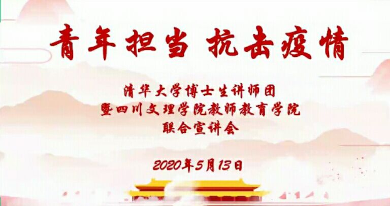 为培养教院学子的责任与担当意识,促进其身心发展,2019年5月12日、13日晚7点,教师教育学院联合清华大学优秀博士生讲师团,以线上网络直播的方式,开展“青年担当 抗击疫情”主题宣讲活动。本次宣讲活动由清华大学水利系2019级博士生张才金和清华大学社科院2019级硕士生郭亭君两位担任讲师,教院全体学生参与听讲。
