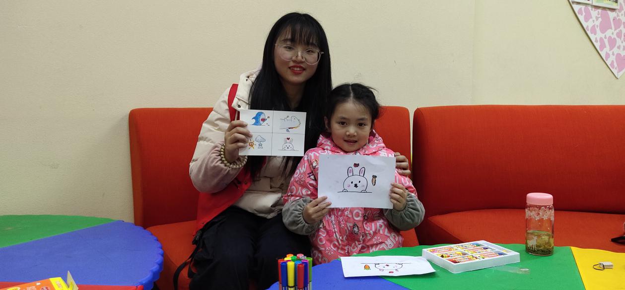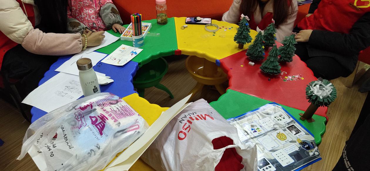 在之后的手工教学过程中,志愿者们教孩子们画了小兔子、大鲨鱼和彩虹小马等简笔画。同时志愿者还教孩子们制作圣诞树,进行有趣的装饰,并让他们许下自己的愿望。