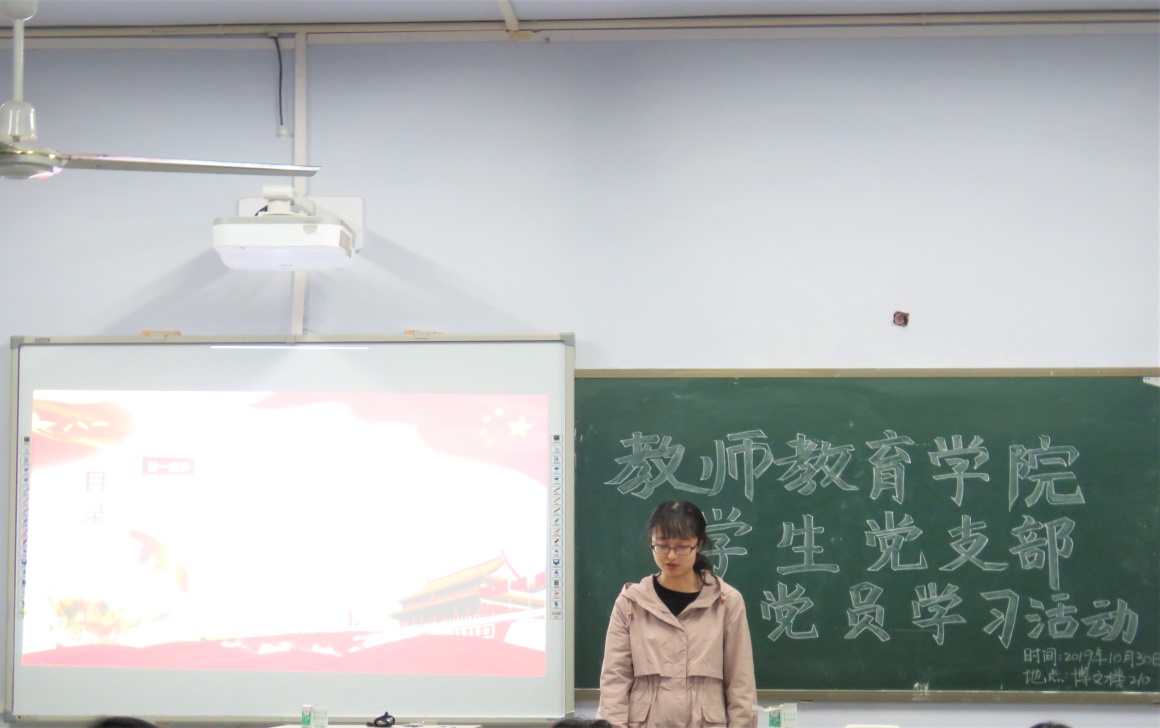 为进一步提升我院学生党支部党员的党性修养,着眼于实现中华民族伟大复兴的中国梦、强国梦,2019年10月30日18:00,教师教育学院学生党支部在博文楼210教室开展了以“庆祝建国70周年”为主题的十月党日活动。教师教育学院团总支马列部席梅舒等马列部成员、莫乾凤等27名学生党员,参加了此次学习活动。本活动由席梅舒同志主持。