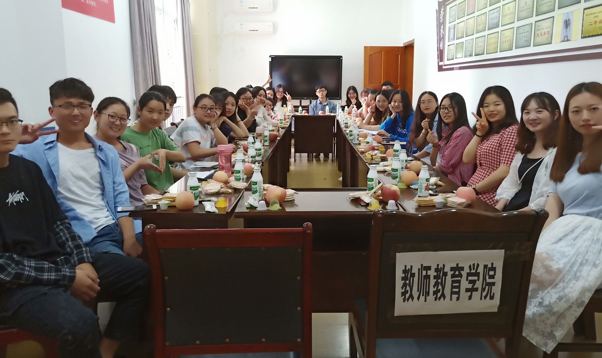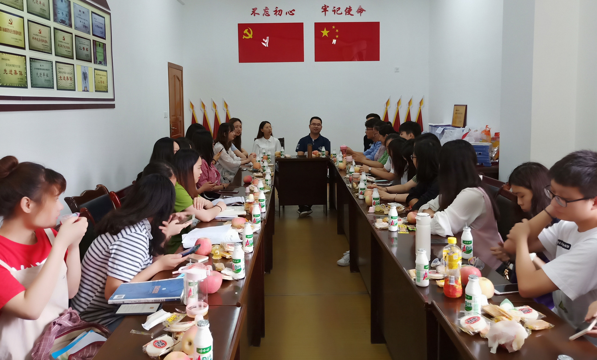 2019年6月17日中午12:30,教师教育学院团总支学生会在博文楼206会议室开展了本学年各部门工作经验交流茶话会。学院团总支副书记兼学工办副主任邓超老师,专职辅导员文娟老师以及各部门部长、副部长参加了此次会议。