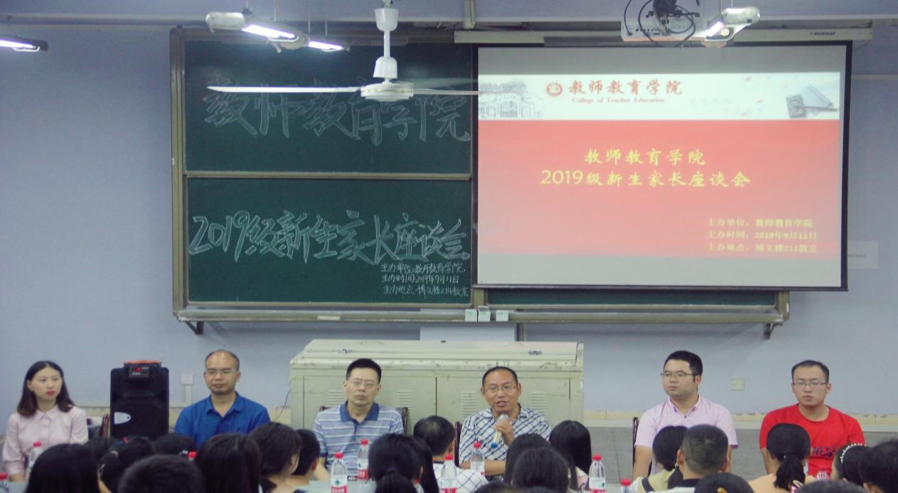 为加强我院师生交流,促进学生发展,教师教育学院于2019年9月11日晚上7点在博文楼214教室成功召开了2019级新生家长座谈会。教师教育学院党总支书记王燮辞教授,院长何树德教授,党总支副书记王斌,团总支副书记兼学工办副主任邓超老师,辅导员文娟、朱小平老师出席了本次座谈会。学院2019级部分新生及家长参加了本次座谈会。