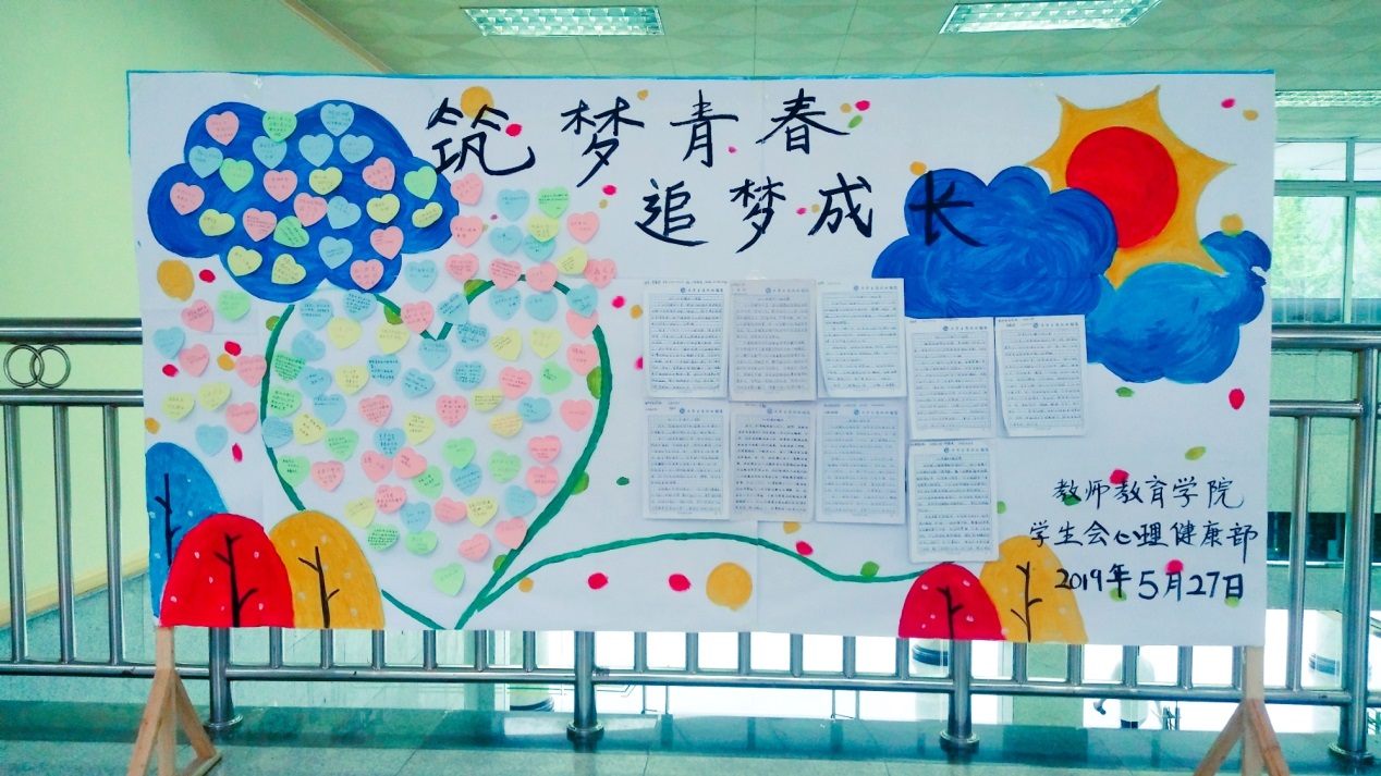 我院还自主开展了心理电影赏析、心理展板、主题班会和心理团辅等活动。2019年5月24日,我院在博文楼208教室开展心理电影赏析活动,同学们积极参与,认真观看电影。并在结束后写下观后感,分享自己对心理健康问题的看法。2019年5月25日~5月31日,我院将制作好的心理展板放在人流量最大的过道旁,以简洁明了的方式给同学们宣传了“5.25”心理健康教育知识。2019年5月26日,我院各班开展以“筑梦青春,追梦成长”为主题的主题班会活动。其中,团辅活动作为今年创新板块,由我院2017级1班应用心理学专业同学对我院2018级同学进行心理团辅。同学们积极参与活动,在团辅活动中释放压力、沁润心灵,并且增强了克服困难的毅力,进而营造了我院和谐友爱的良好氛围。