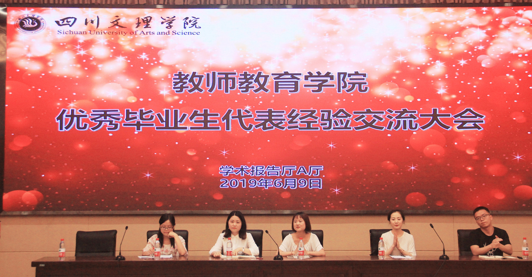 为了充分发挥优秀毕业生的榜样引领作用,激发修业班级学生勤奋学习,积极进取,2019年6月9日晚,教师教育学院在莲湖校区学术报告A厅召开优秀毕业生代表经验交流大会。学院党总支副书记王斌老师、团总支副书记兼学工办副主任邓超老师出席会议,四川省优秀大学毕业生代表石继竹同学、公费师范生代表代鑫同学和何玉倩同学、考研代表林海蕊同学和李欢同学以及大一、大二、大三修业班级同学参加了本次大会。