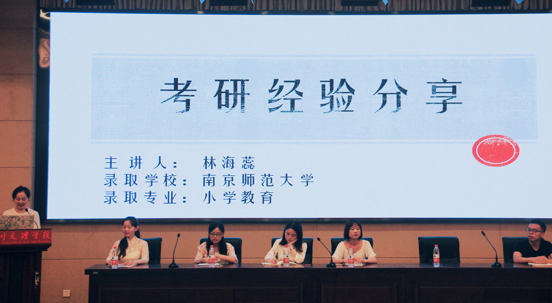 四川省优秀大学毕业生代表石继竹分享了自己的大学学习成长经验。她谈到,在大学里要有远大的目标、清晰的规划、良好的时间管理、自信的态度以及平和的心态。公费师范生代表代鑫、何玉倩分别从如何培养师范技能、求职面试技巧等方面分享了自己学习和求职经验。毕业生考研代表林海蕊从考研原因、考研经历以及复习建议等方面分享了自己考研经验。她鼓励学弟学妹保持良好的心态,严格要求自己,享受青春奋斗的过程。毕业生考研代表李欢从如何选择考研目标学校、如何获取考研信息、暑假该如何备考等方面交流了经验。现场五位大学毕业生代表还与同学们进行了互动交流,为修业班同学们解答疑惑,帮助同学们明确学习的目标和方向。