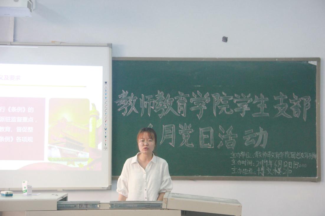 为正确理解和把握《中国共产党纪律处分条例》的精神实质,规范和约束学生党员的行为,2019年6月12日晚6点,教师教育学院学生党支部在博文楼210教室开展了六月党日活动。教师教育学院团总支马列部莫乾凤等马列部成员、谢菲等28名学生党员参加了此次学习活动。本活动由莫乾凤同志主持。