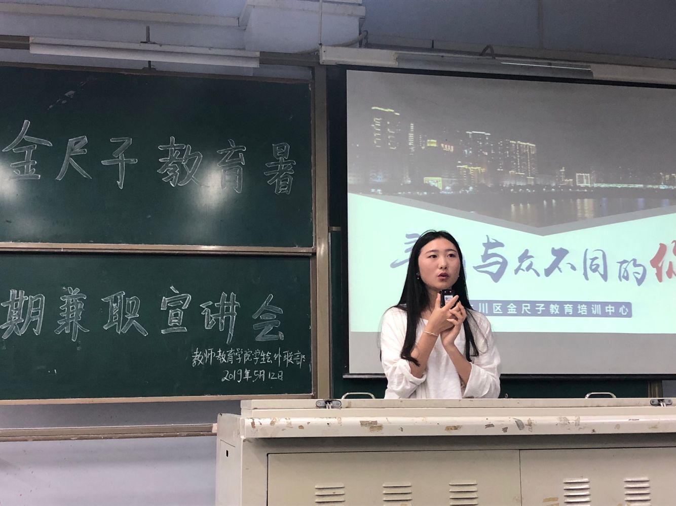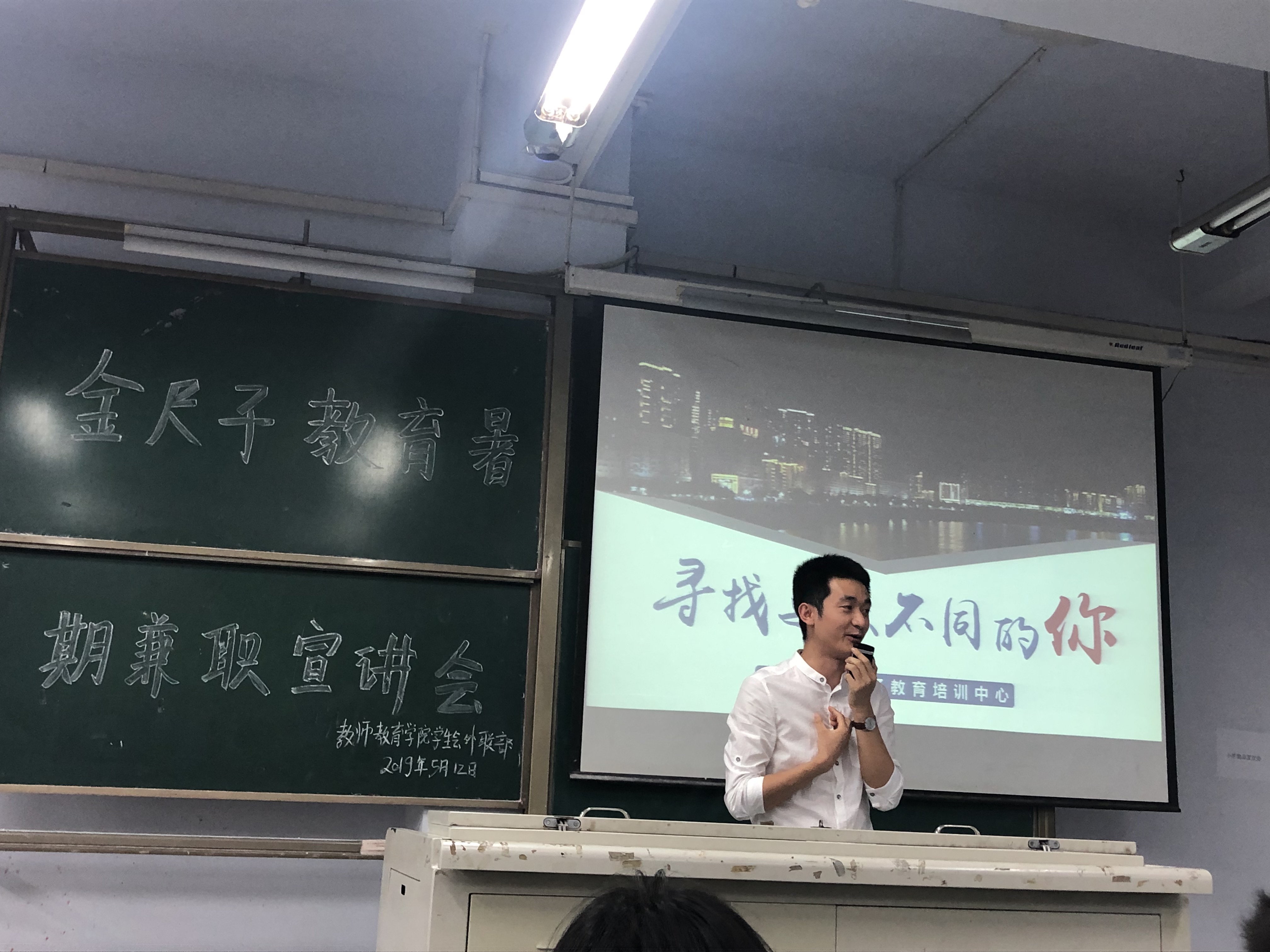 人以信立世,师以德育人。为了让同学们更加充分了解金尺子教育机构的暑假教育实践、顶岗实习以及正式教师的相关情况,2019年5月12日,四川文理学院教师教育学院于莲湖校区博文楼124教室开展了金尺子教育暑期教育实践宣讲会。教师教育学院党总支副书记王斌老师、金尺子教育何鹏程老师以及在其机构工作的钟碎华和吴思丽同学出席本次宣讲会。