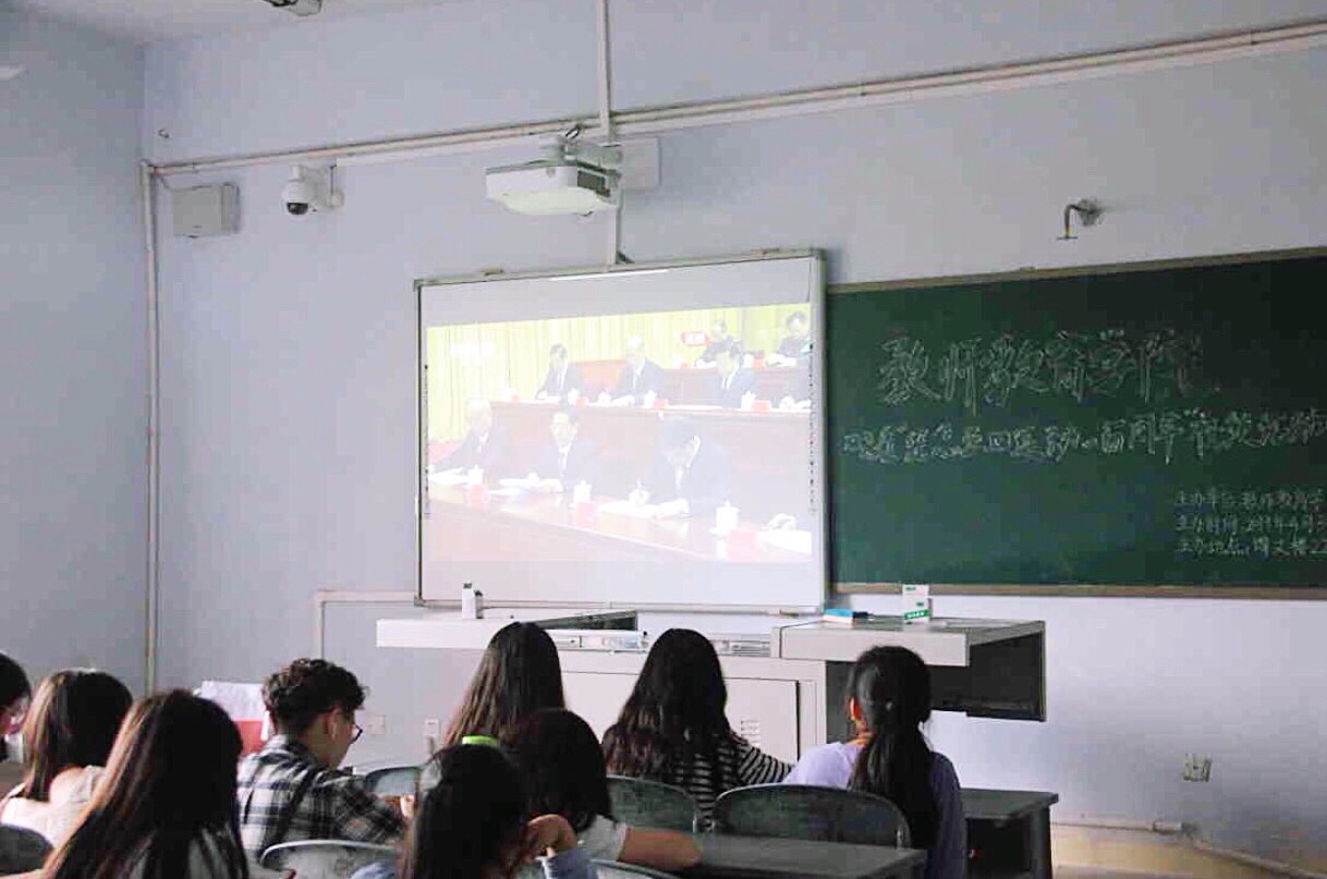 2019年4月30日上午10点30分,教师教育学院组织2017级与2018级部分学生在博文楼206会议室和224教室观看了纪念五四运动一百周年大会直播。学院团总支副书记兼学工办主任邓超老师出席了此次活动。