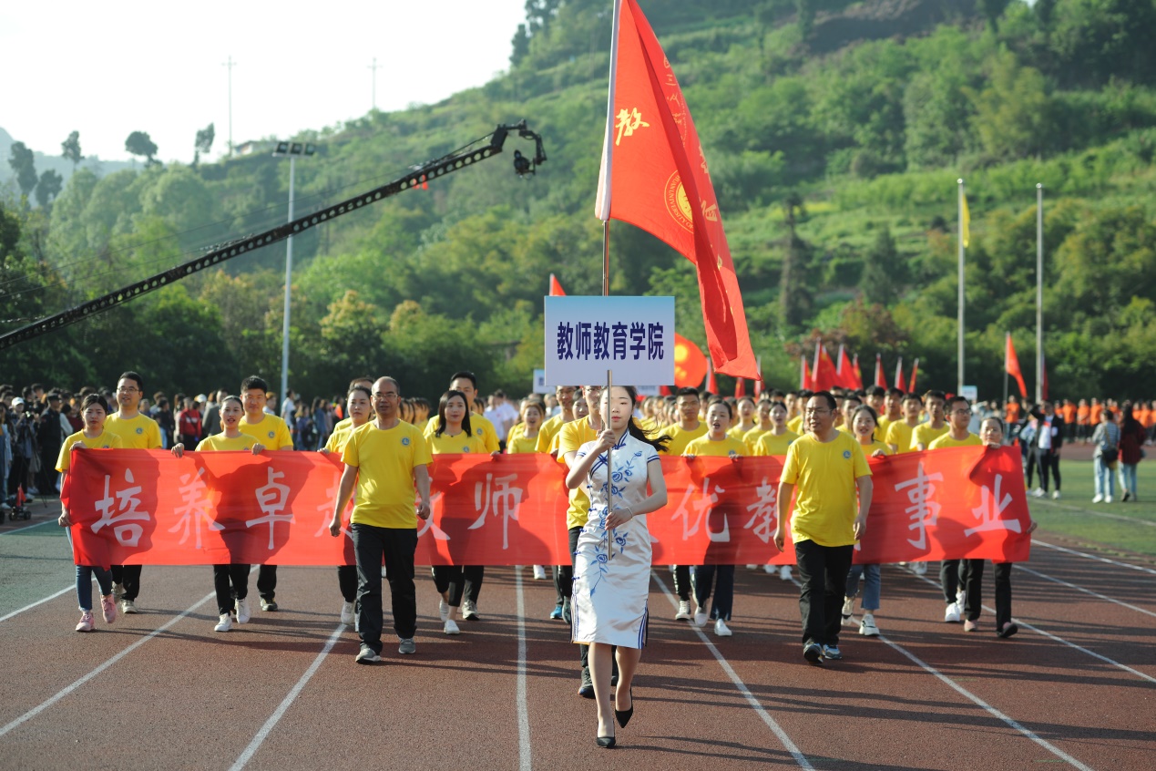 入场式上,伴随着雄壮的《运动员进行曲》,国旗方队、彩旗方队、裁判代表以及参加展演的运动员代表队依次入场,师生们步伐整齐、精神抖擞。各个代表队风采展示五彩缤纷,别具一般的创意队型,以及主席台前展示的舞蹈表演精彩纷呈,把入场式的氛围推向高潮。教师教育学院代表队在学院院长何树德教授、党总支副书记王斌老师带领下,学院师生踏着整齐的步伐来到主席台前。“培养卓越教师,做优教育事业”长长的横幅,展现出了教育学院全体师生坚定的信念。方队成员利用模块道具有创意性的摆出来了“文理”两个大字,拼出学校校徽,突出我院方队主题“凤凰欲飞”,充分体现了文理学院特色,同时也展现了教育学子积极向上的青春面貌。