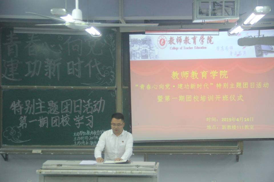 为进一步提高团员的政治素养与思想觉悟,扩大共青团组织的影响,我院于2019年4月14日在博文楼111教室开展了“青春心向党,建功新时代”主题团日团课活动暨第一期团校培训开班仪式。教师教育学院党总支副书记王斌老师、团总支副书记兼学工办副主任邓超老师、辅导员文娟老师、修业班级团支书以及参加团课培训的44名同学参加了本次活动。本次活动由邓超老师主持。