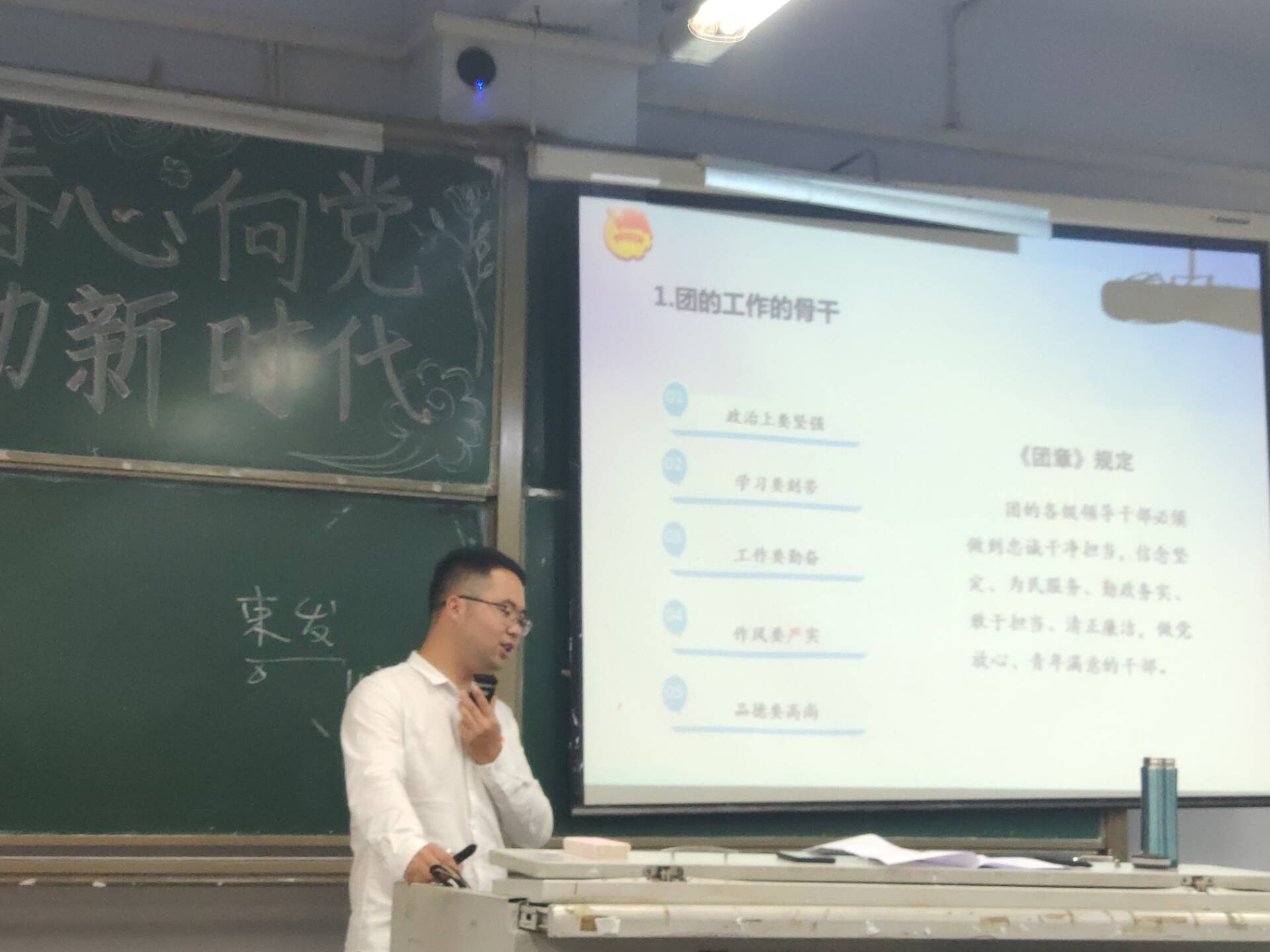 开班仪式结束后,邓超老师带领全体参训人员围绕共青团的历史、共青团性质、共青团职能、共青团组织、共青团标志以及共青团干部这六个方面进行了理论学习。最后他勉励同学们——“在时代滚滚洪流中,不要做流浪者,要做中流砥柱!愿时光不老青春无悔,愿赤诚永不褪色!”