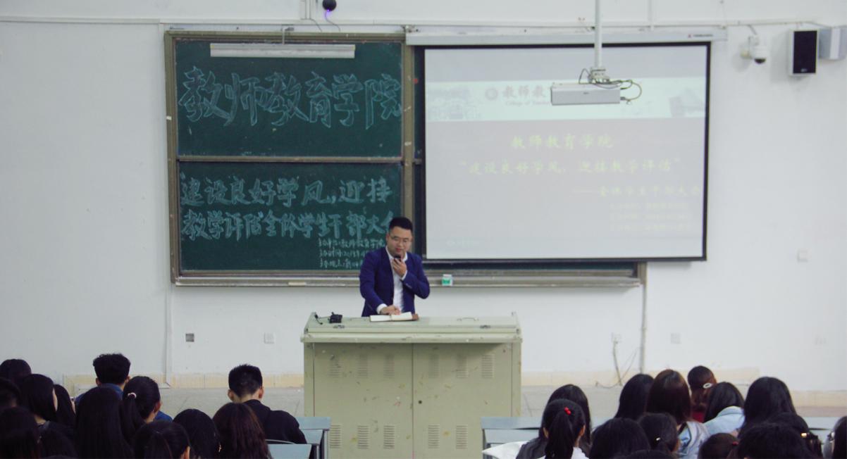 为更好迎接我校4月21日至25日的本科教学审核评估工作,2019年4月16日12点30分,教师教育学院在博文楼114教室召开了以“建设良好学风,迎接教学评估”为主题的全体学生干部大会。教师教育学院党总支副书记王斌,团总支副书记兼学工办副主任邓超老师,辅导员文娟老师,以及全体学生干部参加此次会议。