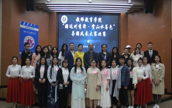 2019年4月16日晚7点由四川文理学院主办,教师教育学院承办的首届“游达州秀泽,赏山水墨画”导游风采大赛决赛在学术报告厅B厅成功举行。教师教育学院党总支副书记王斌老师,党政办主任刘晓老师,团总支副书记邓超老师,生态与旅游学院曹娜老师及文学与传播学院播音与主持专业彭娜老师出席本次比赛并担任评委。