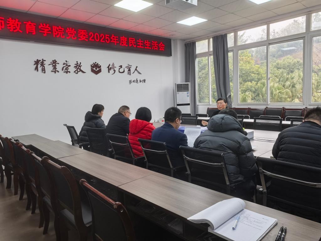 2026年2月5日上午9:00,教师教育学院党委在博文楼206A会议室召开2025年度党员领导干部民主生活会。学校党委常委、副校长邓杰莅临指导,学院党委书记王晶,党委副书记、院长黄培森,正处级组织员刘春辉,党委副书记、纪委书记潘维,副院长赵栅凌,副院长陈立出席会议,会议由王晶主持。