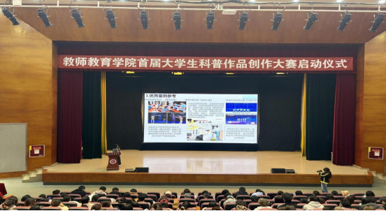 为引导学院广大青年学生弘扬科学精神和科学家精神,参与科学传播,推动发展新质生产力,增强创新创业能力,学院特举办首届大学生科普作品创作大赛。2025年10月31日,教师教育学院于莲湖校区多功能厅隆重举行首届大学生科普作品创作大赛启动仪式,本次大赛以“科技传播与创新创业”为主题。学院党委副书记潘维、学工办主任文娟、全体专职辅导员以及学院各年级学生代表参加启动仪式。